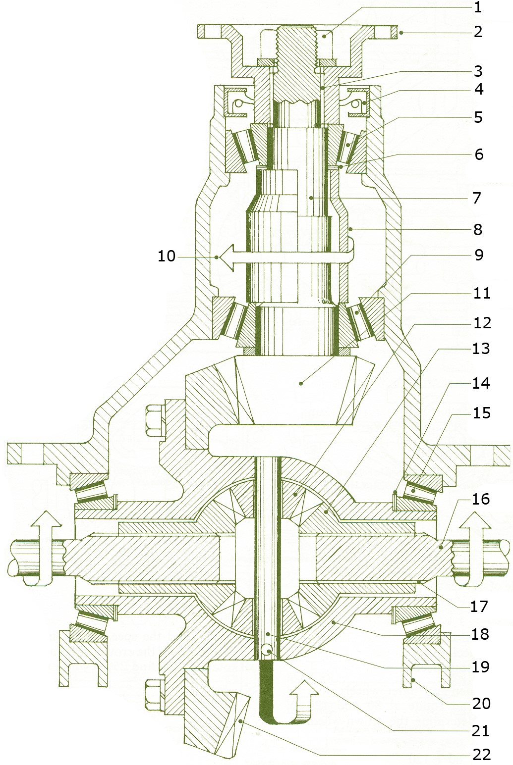 از این چرخ دنده های مخروطی (12) که به وسیله شفت (19) به هوزینگ متصل شده اند